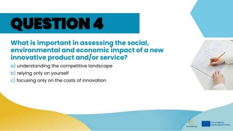 QUESTION 4 What is important in assessing the social, environmental and economic impact of a new innovative product and/or service? a) understanding the competitive landscape b) relying only on yourself c) focusing only on the costs of innovation