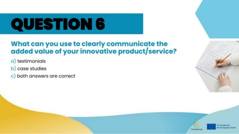 QUESTION 6 What can you use to clearly communicate the added value of your innovative product/service? a) testimonials b) case studies c) both answers are correct
